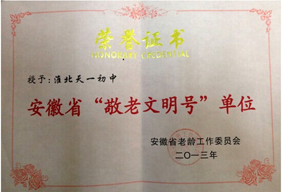 天一初中在注重教育教學的同學,把敬老文明號的創建與精神文明建設相結合,與學雷鋒、樹新風活動相結合,在校內外的社會實踐活動中,大力開展敬老、愛老的各種宣傳,把尊老、敬老、愛老的傳統美德,通過老師、學生去感染自己身邊的人,逐漸形成全社會都關心、關愛老年人的良好社會風氣。通過一年來的尊老,助老主題活動的開展,201312月,淮北市天一初中分別被國家老齡工作委員會及安徽省老齡工作委員會評為“敬老文明號單位”榮譽稱號。20131224,安徽衛視對淮北市天一初中獲得2013年全國“敬老文明號”先進單位還進行了專題報道。