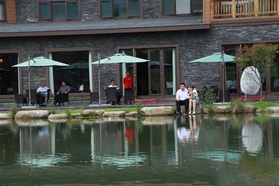 炎炎夏日,有什么比靜心清涼要來的重要!離黃山區譚家橋鎮約五公里遠有一處山坳,這里山巒疊嶂,松柏掩映,一座全木質結構的仿古建筑就矗立于此。會館二層的陽臺就面對著黃山的輪廓,云霧繚繞的黃山奇觀讓你無需遠足即可一覽無余。會館前面一處水潭,碧波蕩漾,水草豐盛,魚兒成群。水潭旁有可以休憩的亭榭和陽傘雅座。這個平靜的地方適合享受清茶和感悟自然。