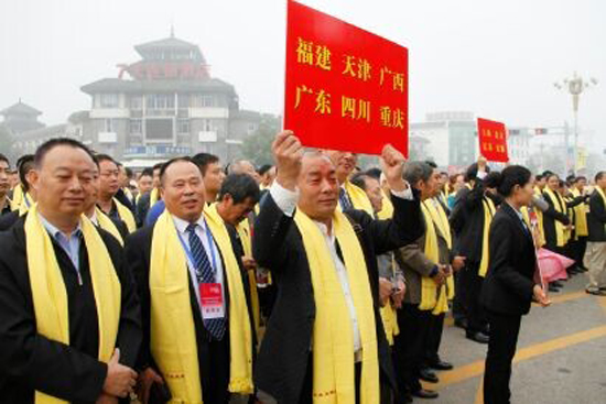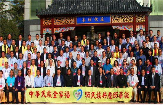 孔氏家族無疑是“中華第一大家庭”。參加家祭的孔子后裔們配合中國少數民族文化藝術促進會《中華民族全家福》組委會拍下這張史上最大的民族全家福(漢族?局部),向新中國65華誕獻禮。(前排配合扯橫幅的人中,56數字之后是世界孔子后裔聯誼總會會長、孔子世家譜常態化續修工作協會榮譽會長