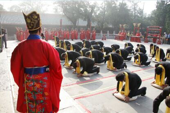 所謂“三獻”,分初獻、亞獻和終獻。 初獻帛爵,帛是黃色的絲綢,爵指仿古的酒杯,由正獻官將帛爵供奉到香案后,主祭人宣讀并供奉祭文。亞獻和終獻都是獻香、獻酒香、酒分別由亞獻官和終獻官將香和酒供奉在香案上,大成殿外,禮生鋪好蒲團,來自不同國家和地方的孔子后裔將依次在此行跪拜大禮。