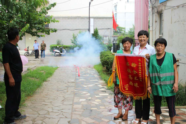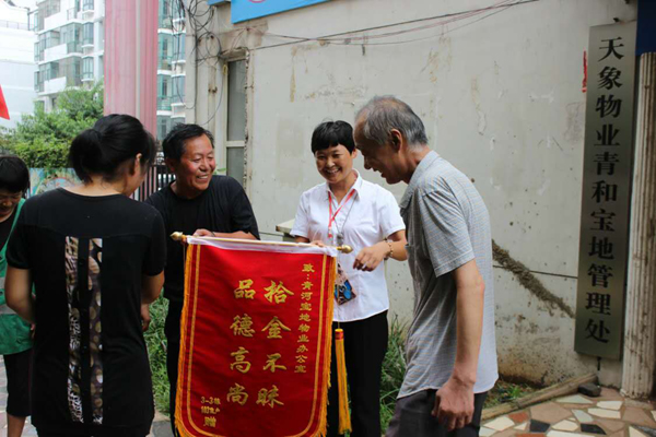 8月2日,淮北天象物業(yè)管理公司保潔員祝道俠和任翠萍像往常一樣在清理小區(qū)垃圾時(shí),撿到一個(gè)皮包,打開(kāi)一看里面裝有一萬(wàn)多元,她們意識(shí)到這包應(yīng)該是業(yè)主不小心遺失的,于是趕緊向物業(yè)公司領(lǐng)導(dǎo)匯報(bào),希望可以及時(shí)聯(lián)系上業(yè)主。物業(yè)公司立即通過(guò)走訪詢(xún)問(wèn)找到了失主,失主喜極于泣,感激萬(wàn)分!事后,業(yè)主將一面寫(xiě)有“拾金不昧,品德高尚”八個(gè)大字的錦旗、水和糖送到了小區(qū)物業(yè)管理處,還燃放了兩掛鞭炮,對(duì)祝道俠和任翠萍兩名同志拾金不昧的義舉表示感謝。